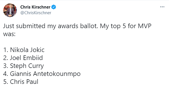 名记Chris Haynes把自己的MVP第一选票(10分)投给了约基奇,第二选票(7分)投给恩比德,第三选票(5分)投给保罗、第四、五选票分别投给利拉德和库里。