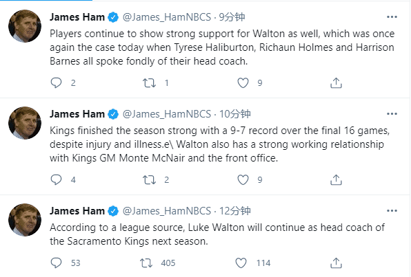 国王跟队记者James Ham报道沃顿下赛季将会执教国王,国王为何没有立即解雇沃顿?名记表示:尽管伤病不断,但国王在赛季最后一段时间表现强劲,最后16场以9胜7负的战绩结束常规赛,球员们大力支持沃顿,哈里伯顿、霍姆斯和巴恩斯都公开支持沃顿。