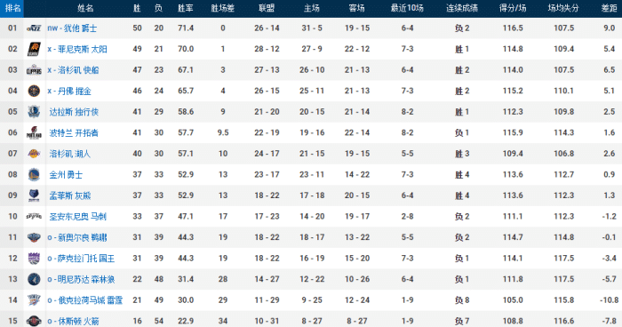 爵士本来拿下西部第一的概率高达97.2%,但可惜的是他们吃到了一波2连败,而直接竞争对手太阳击败开拓者,缩小了和爵士之间的差距。不过领先的依旧是爵士,接下来只要爵士能够力压太阳的话,他们将会创造队史新纪录,那就是拿下常规赛第一的最佳战绩,因为东部第一的费城已经确定无法追上爵士,所以盐湖城的球队是很有可能创造历史的。