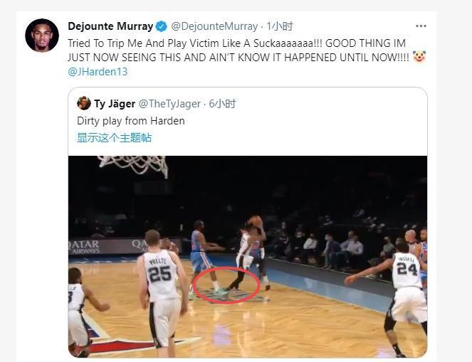 替补出场,哈登拿到了18分7篮板11助攻,将全队上下喂得是满嘴流油,最终篮网队也以128:116击败马刺,迎来了一波三连胜。不过本场比赛,哈登在比赛中也出现了一个争议动作,赛后马刺小将穆雷在社交媒体上发布了哈登防守自己伸腿的视频,穆雷@了哈登怒骂:想要绊倒我,并且还想装成受害者,还好我看到了这个,才知道这些事情的发生。