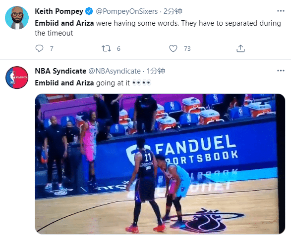 比赛的第一波冲突来自于阿里扎和恩比德,在第一节比赛进行到三分多钟,坐在替补席的阿里扎突然暴起,他冲向了费城核心恩比德就是一通怒骂,恩比德这边也是一边打球一边和阿里扎怒喷,为了避免冲突升级,热火队的助理教练一直劝阻着阿里扎。
