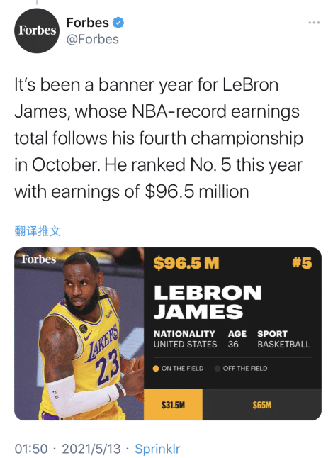 排在第五位的詹姆斯则是NBA球员,他的年收入达到了9650万,而且他同样是一个不会老的神话。其实相比起这么多的收入,詹姆斯更希望在职业生涯结束之前拿到更多的总冠军。