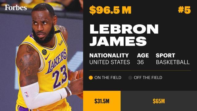 赛季至今,詹姆斯出战43场比赛,场均贡献25分7.9篮板7.8助攻。福布斯杂志刚刚在今天宣布全球年收入排名前十的现役运动员,詹姆斯以9650万美元(场内3150万,场外6500万)的总收入位居第五,仅次于麦格雷戈(无限制格斗)、梅西(足球)、C罗(足球)和普雷科斯特(橄榄球)。