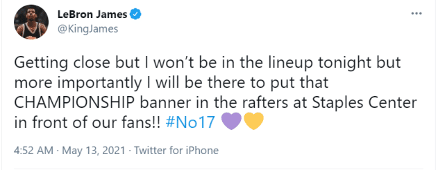 “已经接近(复出)了,但我不会出现在今晚的比赛阵容中。”詹姆斯写道,“但更重要的是我会抵达斯台普斯中心,在我们的球迷面前升起总冠军旗帜!第17个(总冠军)。”