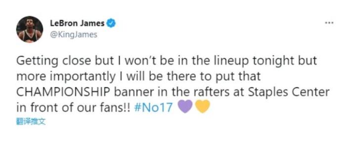 最后是詹姆斯自己给出的答案,为何缺席这场球迷眼中关键的比赛呢?詹姆斯在社交媒体上表示:我已经很接近复出,但我今晚不会出战,不过更重要的事,我会来到斯台普斯球馆,在球迷面前升起总冠军旗帜。