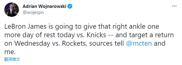 24直播网讯 据ESPN名记沃纳罗斯基报道,詹姆斯因右脚踝扭伤缺席今天湖人和尼克斯的比赛,但他计划明日在对阵火箭的比赛中复出;湖人冲击西部第六的利好,浓眉已经找回状态,詹姆斯也即将复出,詹眉终于又要合体了。
