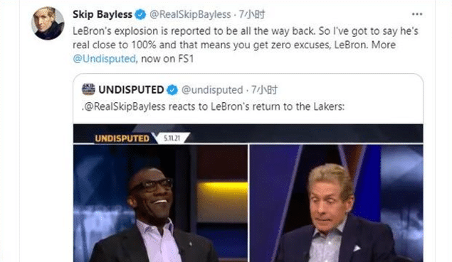 很快当得知詹姆斯会在对阵火箭的比赛中复出,Skip Bayless称这下詹姆斯就没有任何借口了:“勒布朗的回归据说在路上了,所以我可以认为他接近100%状态,这就意味着你再也没有借口了,勒布朗!”