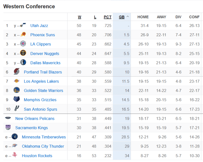 24直播网讯 北京时间5月11日,NBA常规赛结束多场争夺,西部季后赛争夺战有了新的局面。勇士爆冷击败爵士,守住第8的位置,灰熊和马刺赢球,鹈鹕争夺附加赛资格希望渺茫。开拓者击败火箭,取得4连胜,他们再次拉开和湖人的差距,不过未来他们面临3场硬仗,湖人依然有机会追赶。