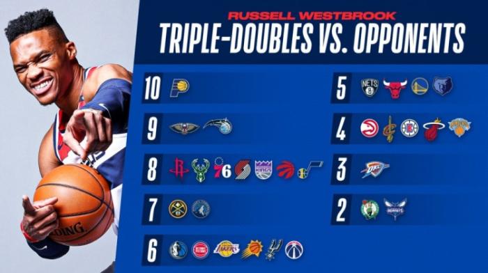 三双王!NBA官推+东契奇等人祝贺,威少冲新纪录:对30队至少轰5次三双!