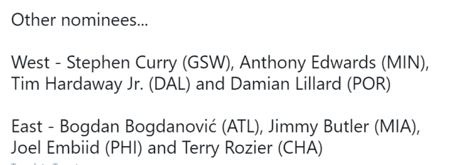 东部:博格丹-博格达诺维奇(老鹰)、巴特勒(热火)、恩比德(费城)、罗齐尔(黄蜂)