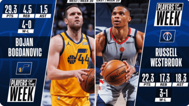 24直播网讯 北京时间5月11日,NBA官方宣布了上周的周最佳球员。东部周最佳属于奇才后卫拉塞尔-韦斯布鲁克,西部周最佳则由爵士前锋博扬-博格达诺维奇当选。