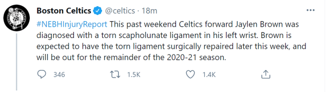 24直播网讯 北京时间5月11日,凯尔特人官方宣布,前锋杰伦-布朗被诊断出左手腕舟月韧带撕裂,预计将在本周晚些时候接受手术治疗,已经确定缺席2020-21赛季余下的所有比赛。布朗的赛季报销,对凯尔特人而言,无疑是一次沉重的打击!