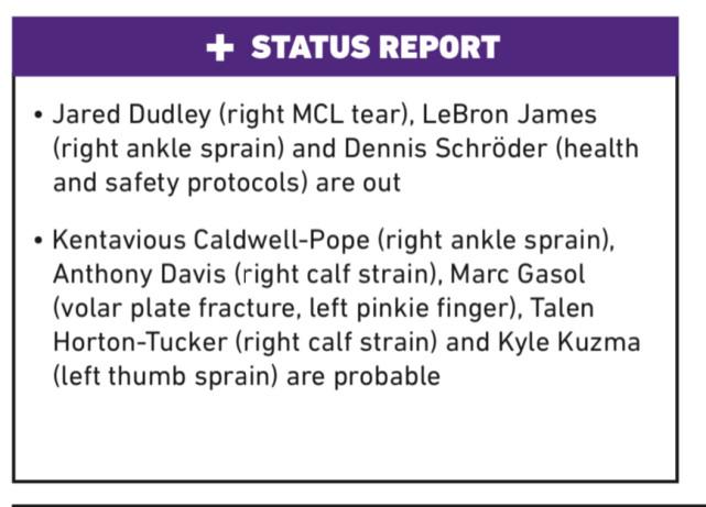 除了詹姆斯,施罗德(健康安全协议)和杜德利(韧带撕裂)也仍然是缺席状态。除了这三位,波普、浓眉、小加索尔、霍顿-塔克和库兹马虽然各有小伤在身,但状态都是probable(大概率上场,75%概率出战)。