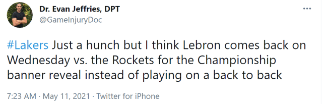医学专家 Evan Jeffries表示,他认为詹姆斯可能在对火箭的比赛中复出,因为届时湖人将举行冠军旗帜揭幕仪式。詹姆斯理论上不能打背靠背,他在对火箭的比赛中复出更合适。