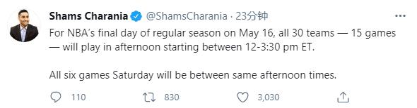 24直播网讯 北京时间5月10日,名记Shams在个人社媒上爆料了NBA常规赛最后两个比赛日的赛程安排,这个密集程度堪称恐怖。