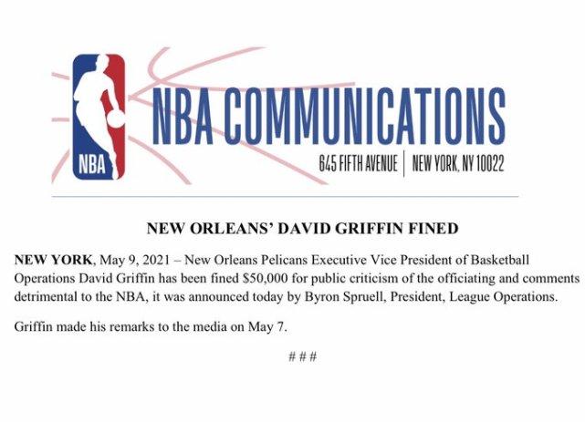 24直播网讯 北京时间5月10日,NBA官方宣布,因公开批评裁判和发表对NBA不利言论,鹈鹕队的篮球运营副总裁兼总经理大卫-格里芬被罚款50000美元。