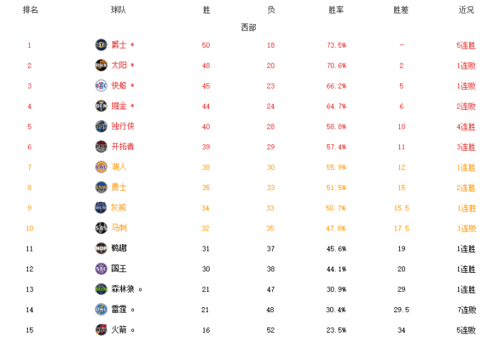爵士昨天击败火箭之后成为了联盟第一支拿到50场胜利的球队,而今天随着太阳的输球,他们在还剩下4场比赛的情况下领先第二名太阳多达2个胜场,只要不出现崩盘,这支处于5连胜的球队将会锁定西部第一,甚至是联盟第一,因为东部榜首的费城输了21场,而爵士只输了18场,来自盐湖城的球队是极有可能斩获常规赛联盟冠军的,也期待接下来他们的表现。