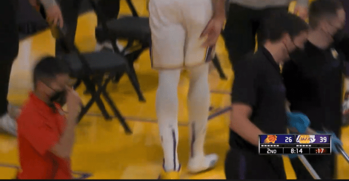 24直播网讯 北京时间5月10日,湖人太阳比赛中,詹姆斯坐在场边为队友鼓劲,浓眉延续火热手感,半场15投8中拿到22分5篮板1盖帽1助攻,在场正负值+17,浓眉把鞋都拼掉了;詹姆斯关心浓眉,多次走到浓眉面前和他互动,期待湖人双巨再次合体。