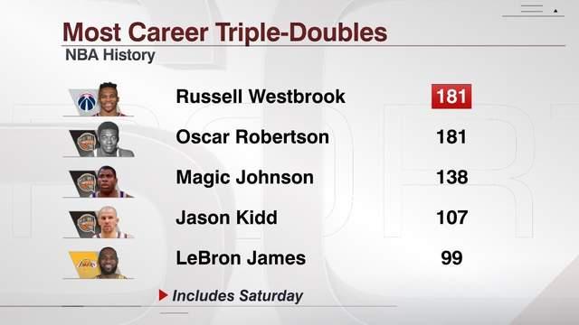 最后一位就是我们熟悉的威少,赛季初期加盟奇才队的时候,不少球迷还在质疑他与比尔两人的能力。随着新赛季的开始,球队表现也不是很好,在这种状况之下,外界看衰他们无缘季后赛的消息也是相当之多。不过随着赛程逐渐减少,球队也是开始爆发,在最近这段时间里,球队也是取得相当不错的战绩,从球队机会上来看,只要继续保持目前的状态,球队将会有资格进入到附加赛。而球队之所以能够拥有如此表现,威少无疑是占据不少的因素,手感的调整,进攻端以及组织端的协调,使得他在比赛中给予球队的帮助增加不少。而如今达成的181次三双数据,相信在之后的时间里,将会打破过去大O所保持的数据,成为联盟三双王。