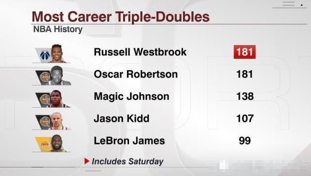 24直播网讯 对于威少来说,这是他球员生涯最重要的一天。就比赛而言,步行者对着奇才,两支季后赛大门外的球队互啄,可是这场比赛如果奇才赢了,他们还是有机会冲击季后赛。就威少而言,如果本场比赛,他能够再次拿到三双,他将比肩传奇名宿“大O”,成为NBA历史三双次数第一的存在。
