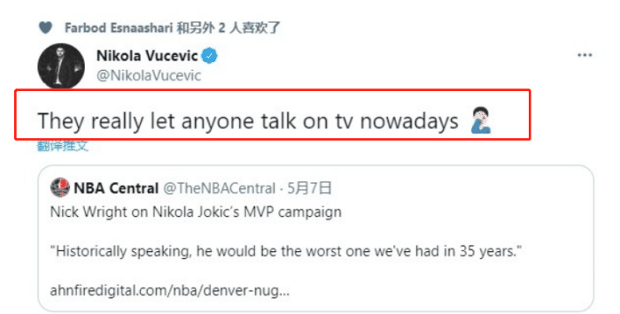 而黑山职业篮球运动员武切维奇则更加直接,“现在谁都能电视上瞎说呗”。显而易见,武切维奇认为Nick Wright的话完全是无稽之谈,非常可笑的言论。而塞尔维亚篮协主席在接受采访时表示,“如果约基奇是美国人,他可能已经赢得6座MVP了”。虽然有些夸大其词,但不难看出,NBA评选重大奖项,可能更青睐美国本土球员。