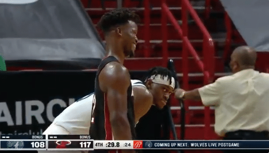 24直播网讯 北京时间5月8日,热火121-112战胜森林狼,巴特勒出战36分钟15投7中拿到25分8篮板6助攻5抢断,带队手刃老东家;本场比赛多人吃到技术犯规,拉塞尔连吃两T被驱逐离场,巴特勒和唐斯互喷吵架也双双吃T;赛后巴特勒怒喷唐斯的脏话曝光。