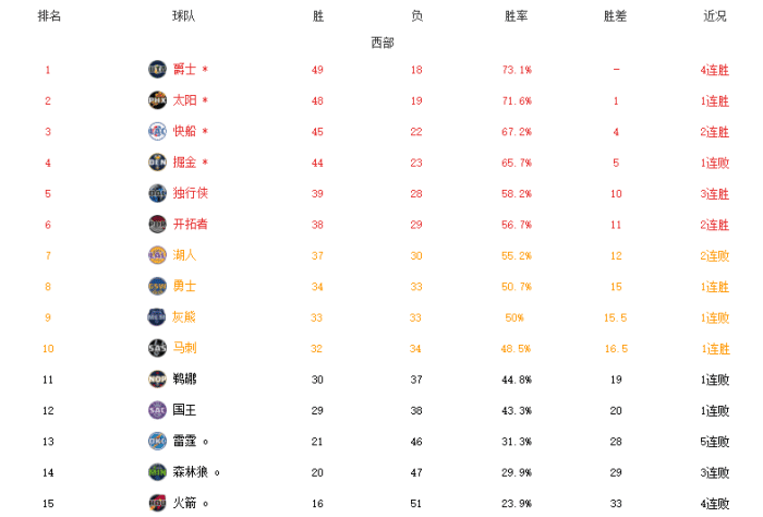 24直播网讯 今天NBA常规赛关注度非常高,尤其是西部的格局发生了很大的变化,其中就包括爵士一波4连胜,很有可能提前锁定常规赛西部第一。掘金输球让第三的快船渔翁得利。开拓者湖人展开生死战,湖人输球之后跌至附加赛。鹈鹕输球后马刺收到利好消息。接下来我们一起来看看西部最新排名: