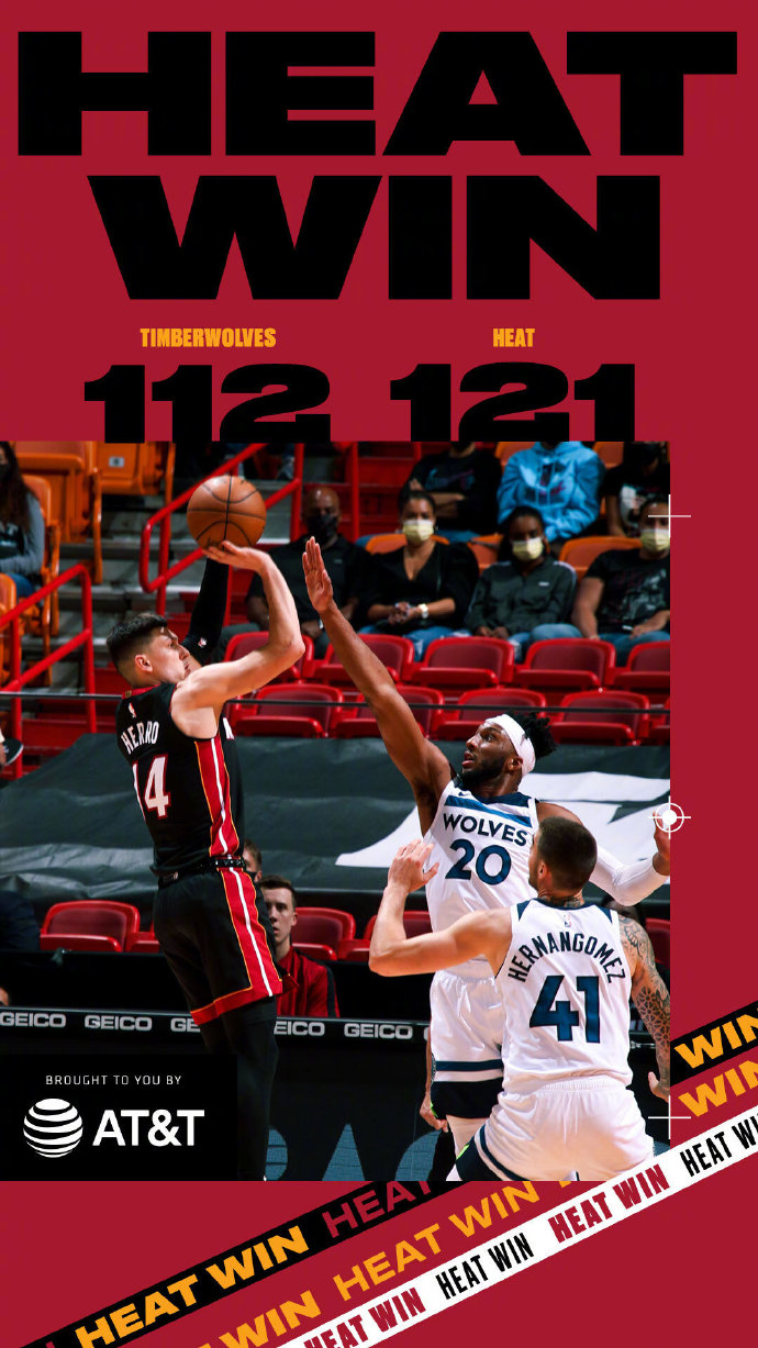 24直播网讯:北京时间5月8日,2020-21赛季NBA常规赛继续进行,迈阿密热火坐镇主场迎战明尼苏达森林狼。全场打完,热火121-112击败森林狼,避免连败的同时,也暂时守住了东部第6的排位。