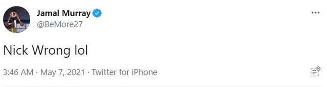 24直播网讯 北京时间5月7日,福克斯体育评论员尼克-怀特谈到了掘金球星约基奇。他认为约基奇今年大概率会拿下MVP,但是他可能是近35年最菜的MVP。结果,掘金球员贾马尔穆雷立刻在社交媒体上发表自己的观点,他直接评论:尼克-错误。(Nick wrong)