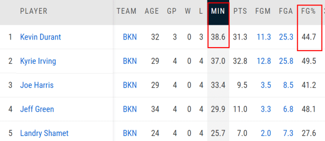 4连败期间,杜兰特场均出场38.6分钟,贡献31.3分9.3篮板3.7助攻,投篮命中率44.7%;欧文场均出场37分钟,贡献32.8分4.3篮板4.5助攻,投篮命中率49.5%。