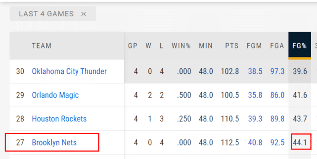 24直播网讯 北京时间5月7日,篮网109-113不敌独行侠,遭遇4连败。篮网究竟怎么了?数据显示,4连败期间,篮网的多项数据排名暴跌,特别是投篮命中率。4连败之前,篮网投篮命中率49.1%,排名联盟第1位,而4连败期间,篮网投篮命中率只有44.1%,排名联盟第27位,只比火箭魔术雷霆强。