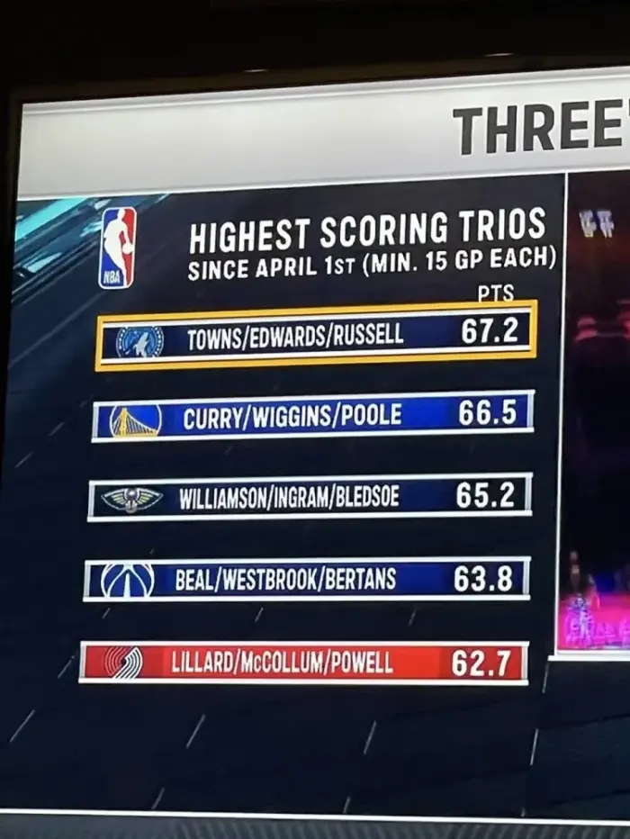 第一名是森林狼,为唐斯+爱德华兹+拉塞尔,场均合砍67.2分;