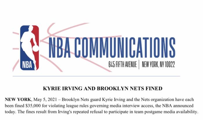 24直播网讯北京时间5月6日,NBA官方开出一笔重大罚单,篮网球星凯里-欧文和篮网队因违反联盟采访规定都被罚款35000美元,NBA官方声明罚款真因——欧文多次拒绝赛后媒体采访,不仅违规被罚款,还牵连篮网遭处罚,累计罚款7万美元。