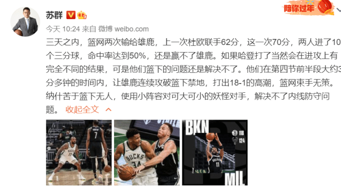 苏群分析这场比赛也谈到了哈登,表示“如果哈登打了当然会在进攻上有完全不同的结果,可是他们篮下的问题还是解决不了。”的确是这样,这场输球的原因不能单单想到进攻,篮网的防守才是关键因素。对抗差、内线缺乏护框高手,这是本赛季一直存在的问题!