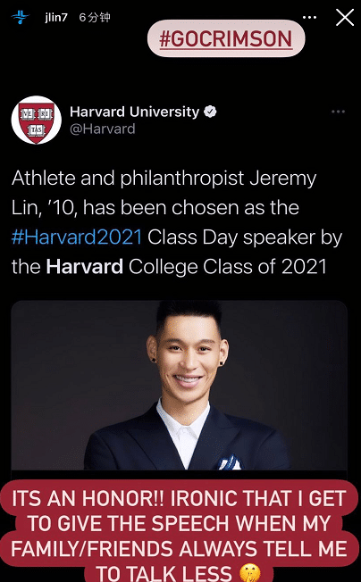 在今天哈佛大学和林书豪已经确认,林书豪将会在5月26日,出席母校的大学毕业典礼,他被选为哈佛2021年毕业日的演讲者。时间上是22天之后,而本赛季的NBA季后赛将会在5月23日揭幕,这也就意味着确认出席母校活动的林书豪,恐怕真的无法进入NBA了。