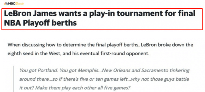 去年3月份,NBA因疫情停赛,而当时詹姆斯为一些有实力进季后赛,但却因为各种原因可能缺席的球队公开发言,他支持联盟举办附加赛类似的比赛,也可能是因为老詹的仗义执言,最终,NBA联盟真的设立了附加赛规则。