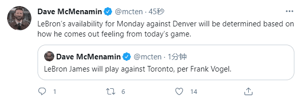 本场对阵猛龙,施罗德因违反防疫协议被隔离,因此缺席比赛;詹姆斯继续首发出战,卡鲁索复出;至于下一场背靠背对阵掘金,詹姆斯是否出战取决于他今晚的感觉。
