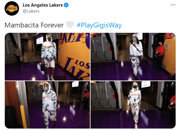 24直播网讯北京时间5月3日,湖人对阵猛龙之前,湖人官方晒入场照,全队身穿Gigi纪念服走进球馆,官推写道:永远的小曼巴(Mambacita,Gigi的昵称)#以Gigi的名义打球;湖人全队集体向科比二女儿致敬,如此举动令人感动。