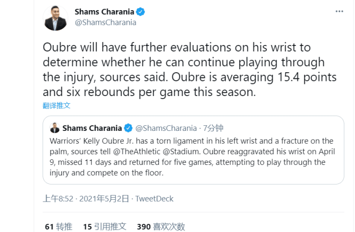 24直播网讯北京时间5月2日,勇士客场挑战火箭,乌布雷连续第二场缺席,名记shams报道,原来乌布雷遭遇了手腕韧带撕裂和手掌骨折两大伤病!值得一提的是,乌布雷在4月9日就加重了手腕伤势,随后缺席了11天时间,复出后打了5场比赛,他试图克服伤病带伤作战,但今天对阵火箭乌布雷再次缺席。shams跟进报道,乌布雷将对他的手腕伤势进行进一步的评估,看看能否带伤出战。赛季至今乌布雷场均可以送出15.4分6个篮板,是勇士主力球员之一,如果乌布雷因为这次受伤导致常规赛报销,那这对于球队来说无疑是一个不小的打击!