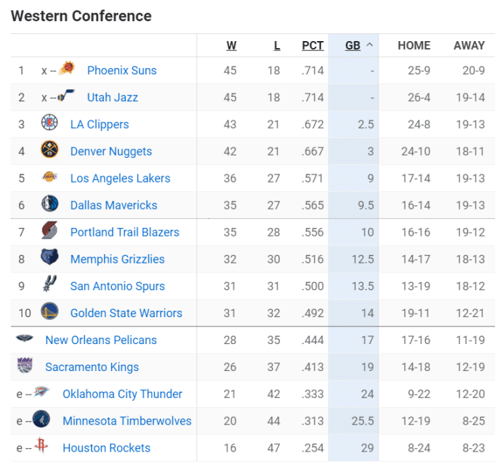 西部最新排名。太阳击败爵士后,已经反超爵士,升至联盟第一的位置,爵士跌至第二,快船落后2.5个胜场,排名第三。掘金目前连战连胜,他们完全有机会把快船挤到第四,目前湖人、独行侠和开拓者三队竞争激烈,不排除在最后几场常规赛中,独行侠、开拓者、掘金三队做局,让湖人和快船在首轮相遇,毕竟开拓者和掘金也是老谋略家了,当初他们就曾安排火箭西部半决赛打勇士。而在后面的排名中,火箭16胜47负傲视群雄!