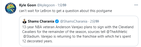 瓦莱乔签约骑士重返NBA太让人意外,湖人记者Kyle Goon转发名记的动态,并且发推写道:等不及听到詹姆斯在赛后回应关于这个问题(瓦莱乔重返骑士)