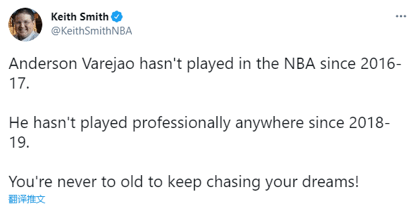 名记Keith Smith发推写道:自从2016-17赛季之后,瓦莱乔就没有参加过NBA比赛;2018-19赛季以来,他从未在任何地方打过职业比赛,你永远不会放弃追逐你的梦想!