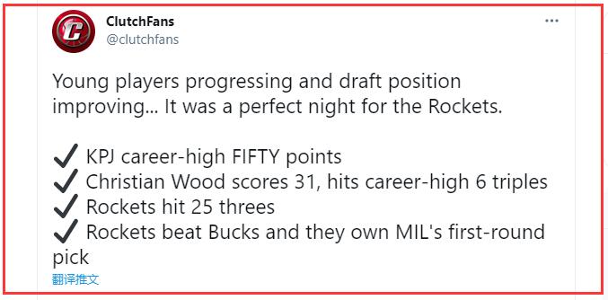 而本场比赛过后,美媒《ClutchFans》就列出了火箭队本场比赛战胜雄鹿的4点收获,在他们看来,这场比赛,堪称火箭队的完美之夜: