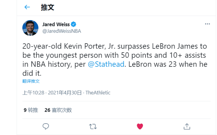据记者weiss统计,20岁的凯文波特超越23岁詹姆斯成为NBA历史上单场砍下50分10助攻最年轻的球员!