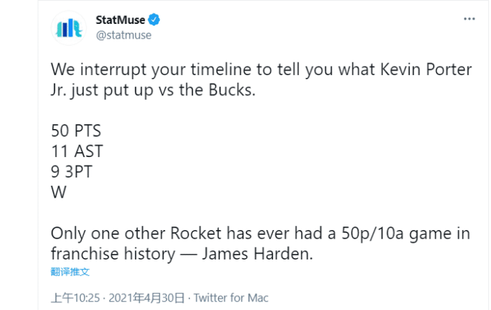 据statmuse统计,在凯文波特之前,火箭队史上只有哈登曾经拿到单场50分10助攻,波特一战成为火箭队史第二人!