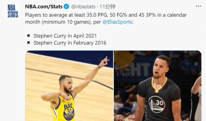 整个4月份,库里的表现无疑是现象级的,单月96记三分创历史纪录!单月13次30+超越科比,成为NBA历史上33岁以上球员单月拿到30分次数最多的球员!据NBA官推报道,库里整个4月能以50%的命中率和45%的三分命中率场均砍下35+,比肩2016年2月的自己!历史唯二,被库里一人包揽!