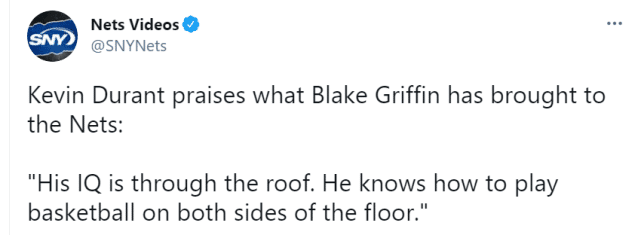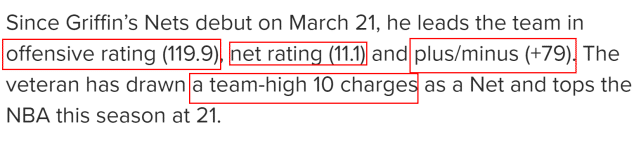自从3月22日上演篮网首秀以来,格里芬有4项数据排名同期全队第一,分别是他的进攻效率(119.9)、百回合净胜分(11.1),个人累计正负值(+79)和造对手进攻犯规次数(10次)。