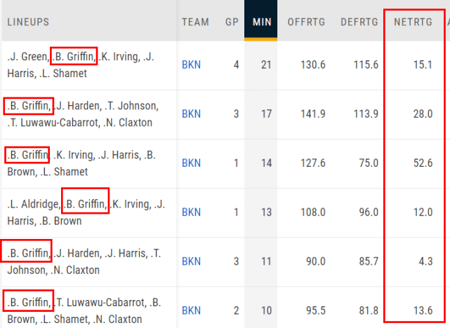不得不说,格里芬的特点,几乎适合在篮网的任何一套阵容里打球,当他在场上时,篮网往往都占据优势。数据显示,格里芬在场至少10分钟的6套篮网阵容,都是赢分状态,其中5套百回合赢分至少在12分以上,赢分最多的一套阵容是:欧文+格里芬+布朗+哈里斯+沙梅特,这套阵容用过14分钟,百回合赢对手52.6分!