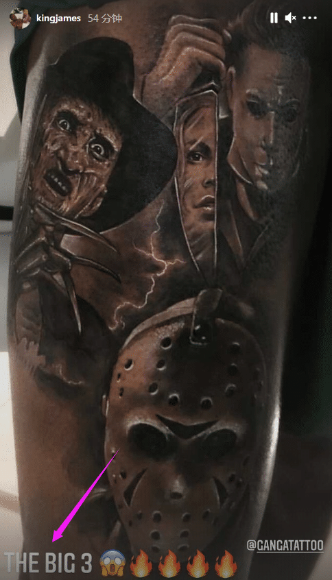 不久前,詹姆斯更新社交媒体,曝光自己大腿上的一处新纹身,晒照并且配文写道:三巨头。