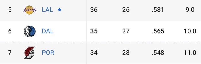 目前湖人36胜26负排在西部第五位,可随着独行侠又赢球,湖人仅仅领先独行侠1个胜场,因此湖人西部第五的位置越来越不稳,随后都有可能掉到西部第六;另外湖人仅仅领先开拓者2个胜场,常规赛还剩下8场比赛,湖人已经输不起了。